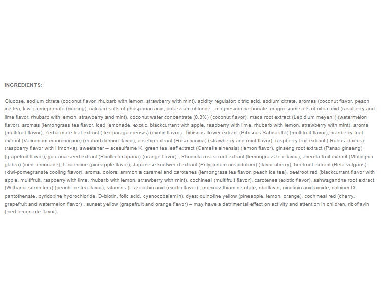 глюкоза, лимонная кислота, цитрат натрия, кальциевые соли орофосфорной кислоты, хлорид калия, карбонат магния, ацесульфам K, экстракт семян гуараны (Paullinia cupana), ароматизатор, витамины, красители