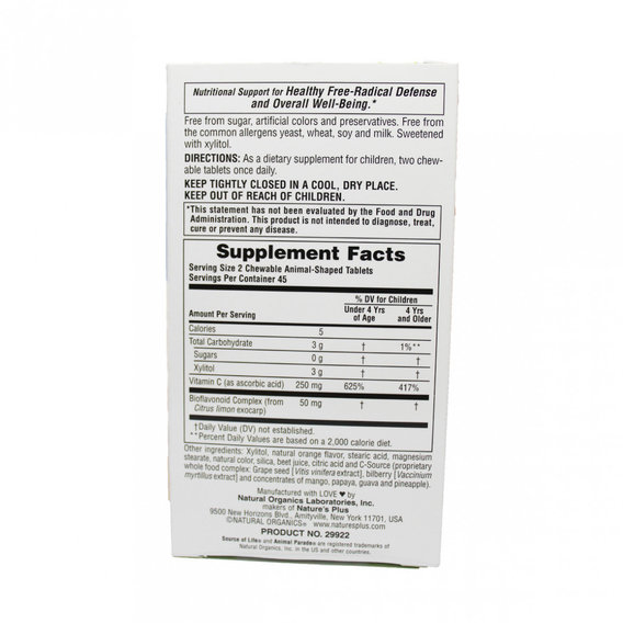 Animal Parade представляет витамин С без сахара со вкусом апельсина, специально для детей. Витамин С, также известный как аскорбиновая кислота, - это водорастворимый витамин, который не синтезируется в организме и попадает в него из пищи. Он является главным защитником иммунной системы, а также важен для роста и восстановления тканей во всем теле.