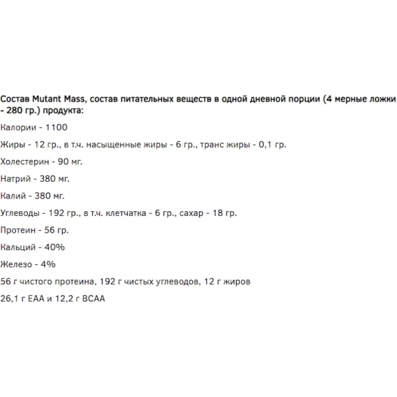 Каждая порция содержит 56 грамм протеиновой матрицы Mutant Mass Pro-Matrix. Уникальная протеиновая матрица снабжает организм 6 видами белка, которые обеспечивают, пролонгированое поступление аминокислот! Когда вы сочетаете мощную протеиновую матрицу с другими ключевыми анаболическими ингредиентами содержащимися в MUTANT MASS, вы получаете непревзойденную формулу для быстрого набора массы!