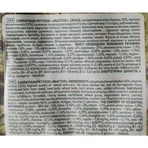 Премиум корм ТМ Carpathian Pet Food «Inactive» для малоактивных, кастрированных и стерилизованных котов и кошек, всех пород. Наши эксперты позаботились о безопасности здоровья малоактивных, кастрированных и стерилизованных котов и кошек, поэтому снизили уровень жиров и углеводов, пропорционально увеличивая содержание протеина. Именно благодаря этому, снижен риск возникновения ожирения, уменьшение нагрузки на опорно-двигательную, сердечно-сосудистую и мочевыводящую системы. Содержание в корме L-карнитина усиливает процесс расщепления жиров, способствует снижению избыточного веса, усиливает белковый обмен, что улучшает тонус мышц и поддерживает работу сердца.