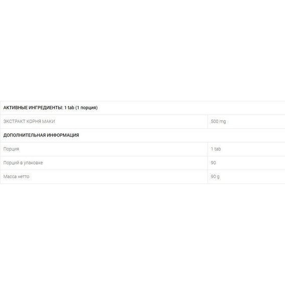 OstroVit Maca - диетическое дополнение в таблетках, содержащее экстракт корня мака. Мака перуанская является травянистым многолетним растением. Способствует накоплению миоглобина в мышечной ткани и секреции анаболических гормонов, которые увеличивают мышечную силу и физическую выносливость. Мака перуанская увеличивает жизненную энергию, выносливость, повышает стрессоустойчивость, что очень важно при современном ритме жизни. Стимулирует половую функцию, является афродизиаком (усиливает половое влечение и эрекцию). Воздействуя на нервную систему, улучшается функция предстательной железы и гормональный обмен.
