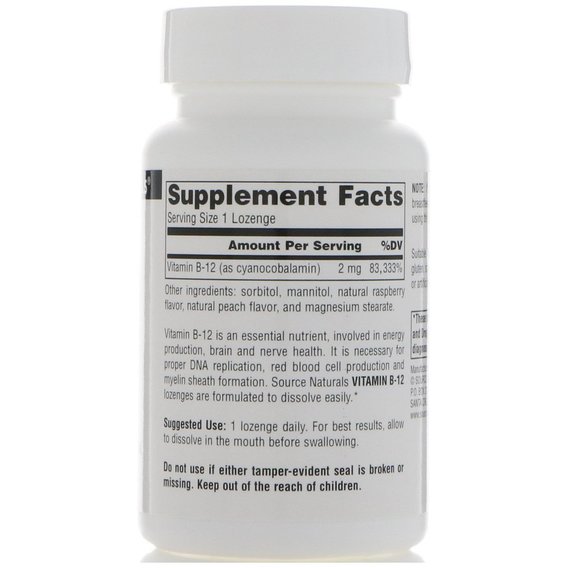 Витамин B-12 – это незаменимый питательный элемент, который участвует в выработке энергии и нормальной работе нервной системы. Он также необходим для репликации ДНК, выработке красных кровяных клеток и образования миелиновой оболочки. Пастилки с витамином B-12 от Source Naturals очень быстро растворяются во рту.