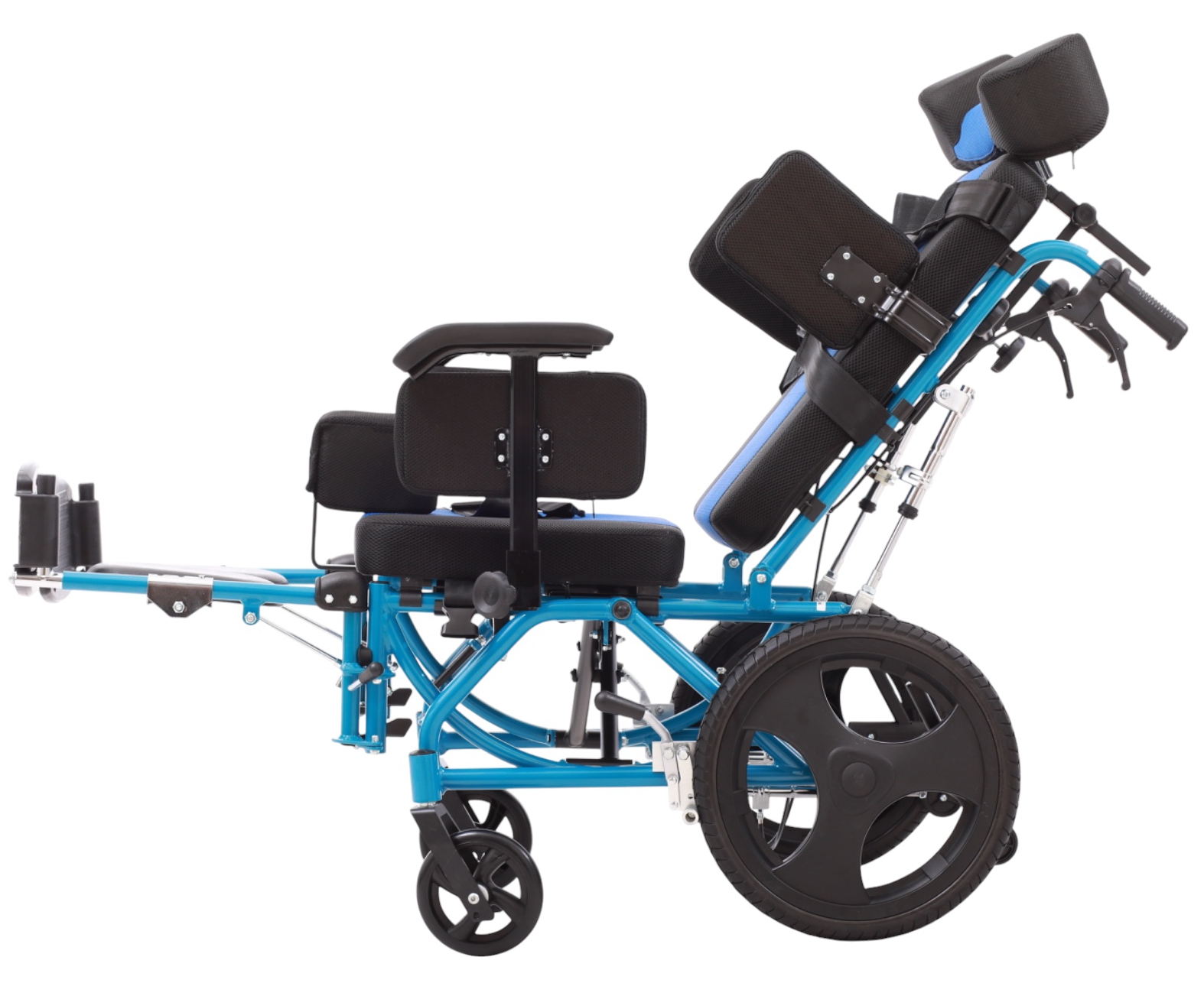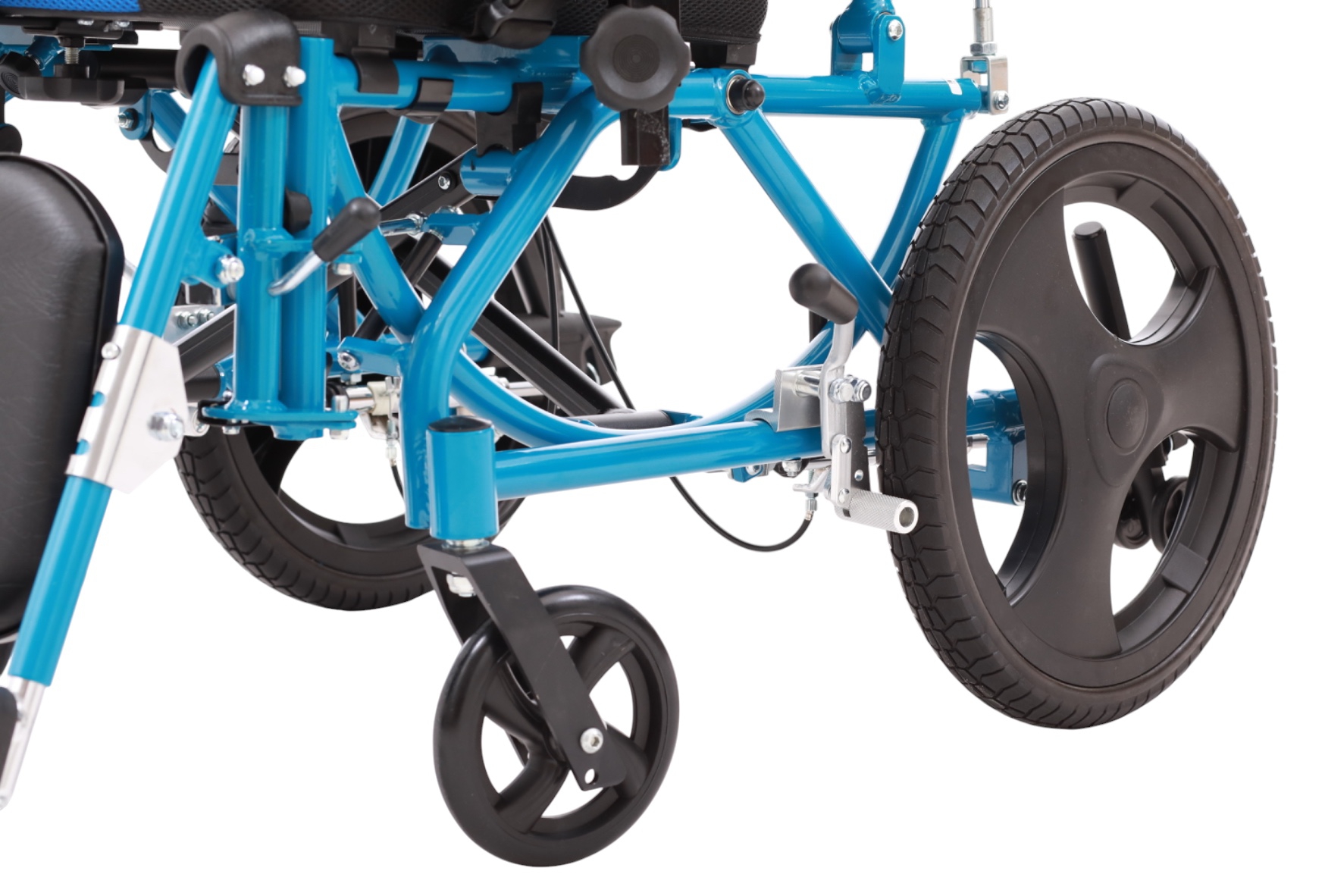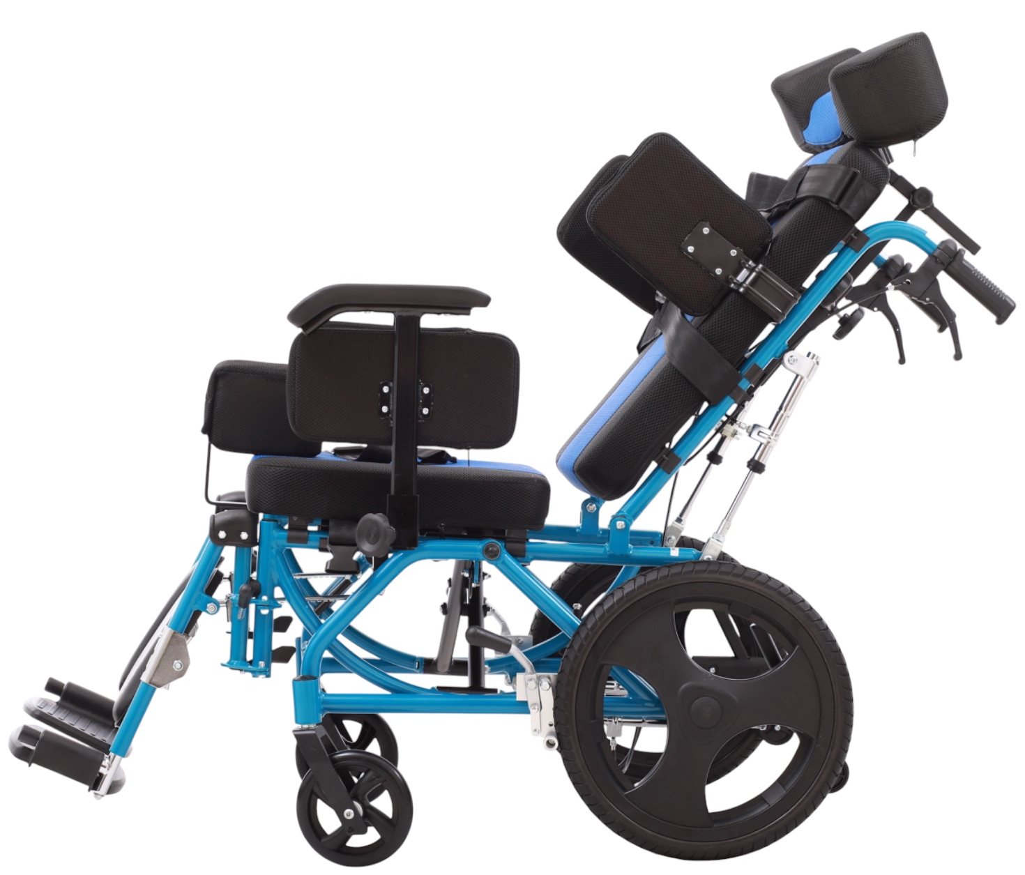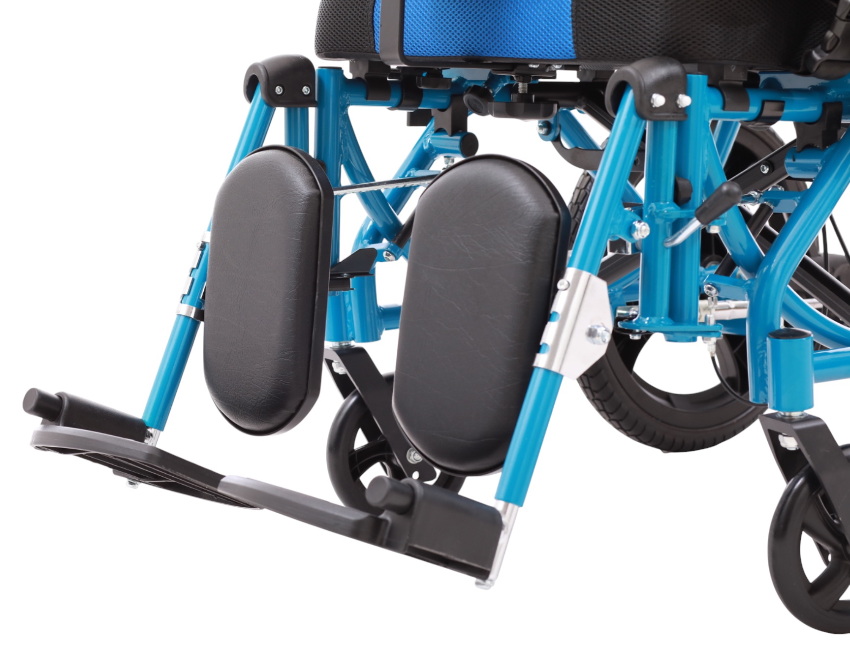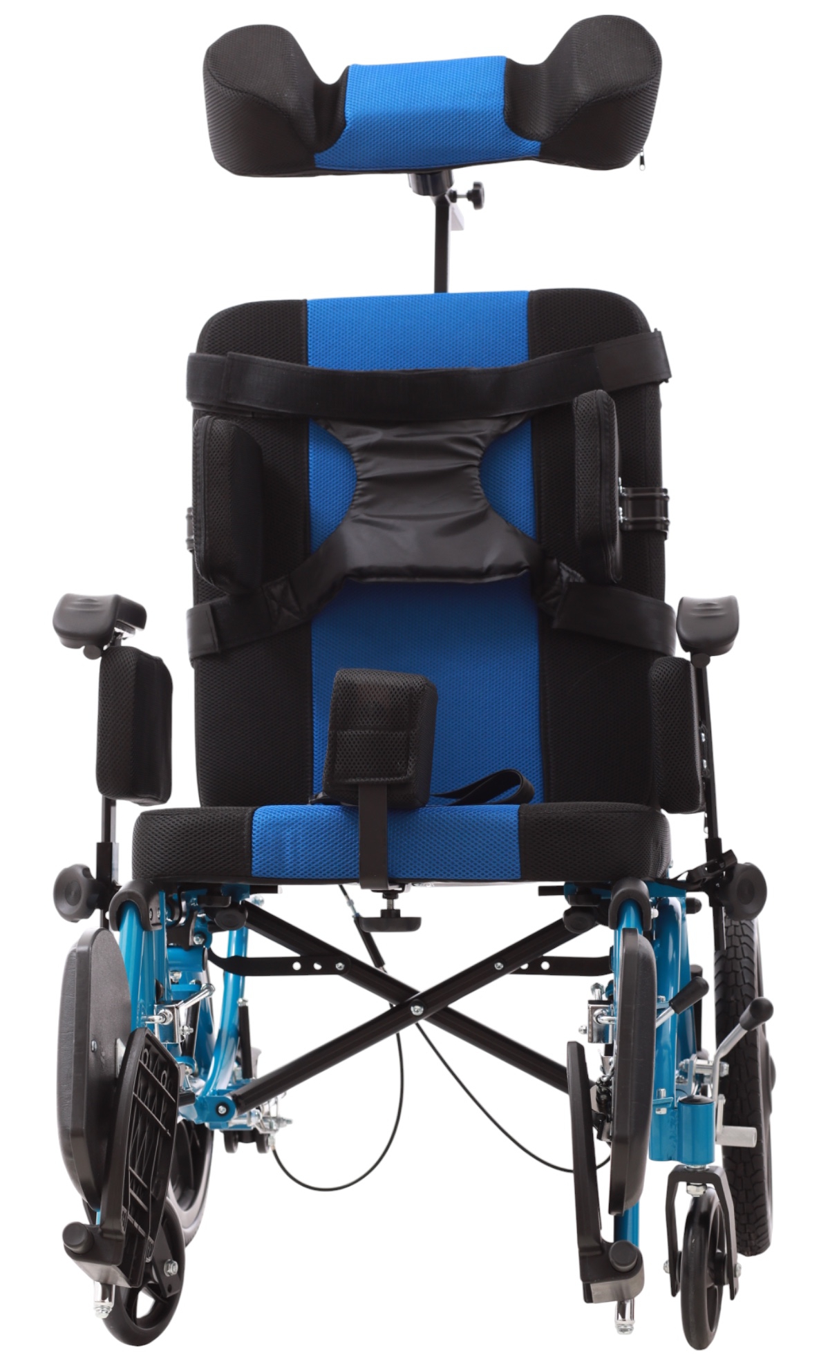 Багатофункціональна інвалідна крісло-коляска, призначена для дітей з дитячим церебральним паралічем MED1-KY958LC-A-46 та іншими порушеннями опорно-рухового апарату. Вона призначена для використання як у приміщенні, так і на вулиці. Регульований нахил сидіння та спинки до 90°: Ця функція дозволяє змінювати кут нахилу сидіння та спинки одночасно, що забезпечує правильне положення тіла, допомагає розвантажити хребет та зменшити ризик виникнення пролежнів. Складна конструкція: Крісло-коляска має складану раму, що робить її зручною для зберігання та транспортування, у тому числі у багажнику автомобіля. Підніжки, що регулюються: Підніжки знімні, регулюються по висоті і куту нахилу до 90°, а також мають підтримку для гомілки. Підголовник знімний його головне завдання — забезпечити надійну підтримку голови та шиї, що критично важливо для правильного положення тіла та комфорту. Елементи фіксації: Для стабілізації тіла та запобігання падінню крісло оснащене абдуктором (розділяючим ноги), а також підтримуючими подушками та ременями безпеки. Матеріали: Коляска має міцну алюмінієву раму. Виготовлений з м'якого матеріалу з поверхнею, що дихає (сітчаста тканина), що забезпечує комфорт при тривалому використанні. Додаткова фіксація: Для забезпечення правильного положення тіла та запобігання падінню крісло-коляска має бічні подушки (абдуктори), які підтримують таз та тулуб, а також регульовані підніжки. Гальма: На задніх колесах встановлені гальмівні механізми фіксації коляски на місці. Ручки помічника: Ліва регулює кут нахилу спинки,права кут нахилу всієї конструкції назад Безпека: Захищає голову від випадкових ударів. Параметри упаковки: Вага виробу 26.8 ;Габарити пакування 85×38×101 Характеристики Колір рами: блакитний Ширина сидіння: 48 см Глибина сидіння: 39 см Загальна ширина: 66 см Загальна висота: 115 см Висота сидіння від підлоги: 44 см Висота спинки: 53 см Передні колеса: 15 см Задні колеса: 38 см Ширина між грудною фіксацією мінімальна: 33 см Ширина між грудною фіксацією максимальна: 41 см Ширина між підлокітниками: 51 см Довжина підлокітника 26 см Висота від сидіння до грудної фіксації 3 режими: 1:16см, 2:20см, 3:24 см Висота підлокітника мінімальна від підлоги: 64.5 см Висота підлокітника максимальна від підлоги: 74.5 см Висота підлокітника від сидіння мінімальна: 14.5 см Висота підлокітника від сидіння максимальна: 24.5 см Відстань від спинки до підголівника мінімальна: 5 см Відстань від спинки до підголівника максимальна: 13 см Висота від сидіння до підголівника мінімальна: 49 см Висота від сидіння до підголівника максимальна: 63 см Вага виробу: 26.8 кг Максимальне навантаження: 75 кг Габарити пакування 85×38×101 Використання інвалідного візка MED1-KY958LC-A-46 допомагає дитині брати участь у повсякденному житті, відвідувати заняття, спілкуватися з друзями та сім'єю. Коляска підходить як для дому, так і для прогулянок на вулиці. Вона оснащена надійними гальмами та антиперекидальними колесами, які підвищують безпеку на схилах. Коляска має складну конструкцію, що полегшує її зберігання та транспортування. Її легка алюмінієва рама робить коляску зручною для осіб, що супроводжують.