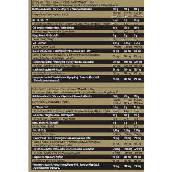 • протеиновую смесь из концентрата, изолята и гидролизата сывороточного белка, а также гидролизованного казеина – питает ваши мышцы ключевыми аминокислотами сразу после приёма, а также на протяжении 6-8 часов, подавляет катаболизм, стимулирует синтез белка и рост сухой массы, ускоряет восстановление в условиях интенсивных физических нагрузок, укрепляет иммунитет;• углеводную матрицу из мальтодекстрина и глюкозы – значительно повышает запасы гликогена, используемого в качестве источника энергии, увеличивает работоспособность и производительность на тренировках;• гидроксиметилбутират кальция (Ca HMB) – естественный метаболит лейцина, который обладает максимальной биодоступностью, ускоряет рост силовых показателей и гипертрофию мышц, защищает их от разрушений;• таурин – повышает сопротивляемость организма внешнему стрессу и общий энергетический потенциал, усиливает тонус и бодрость, снижает утомление и усталость;• моногидрат креатина – поддерживает анаболизм, способствует быстрой регенерации запасов АТФ, необходимого для выполнения скоростно-силовой работы, позволяет повысить количество повторений в рабочих сетах, а также вес на снарядах, увеличивает объёмы мускулатуры за счёт удержания воды в клетках;• D-аспарагиновая кислота – стимулирует секрецию тестостерона и гормона роста, улучшает работу ЦНС во время силовых тренировок, усиливает мотивацию, поднимает настроение, поддерживает активный анаболизм;• аргинин – увеличивает концентрацию оксида азота в организме, расширяет кровеносныесосуды, улучшает транспорт кислорода и питательных веществ в мышечную ткань, ускоряет выведение продуктов катаболизма, обладает выраженным эффектом накачки мышц, повышает интенсивность занятий в зале;• орнитин – усиливает продукцию инсулина и гормона роста, укрепляет иммунитет, подавляет распад мышечной ткани;• экстракт пажитника – благотворно влияет на деятельность нервной и сердечно-сосудистой систем, улучшает метаболизм жиров, оказывает антиоксидантную защиту.