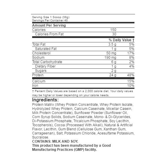Состав: протеиновая смесь (концентрат сывороточного протеина, изолят сывороточного протеина, гидролизат сывороточного протеина, концентрат молочного протеина, мицеллярный казеин, казеинат кальция) подсолнечное масло порошок, с пониженным содержанием жира какао порошок (7%), специи и пряности, загустители (целлюлозная смола, ксантановая камедь, каррагинан), хлорид натрия, подсластители.