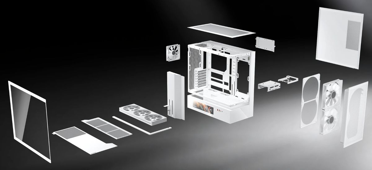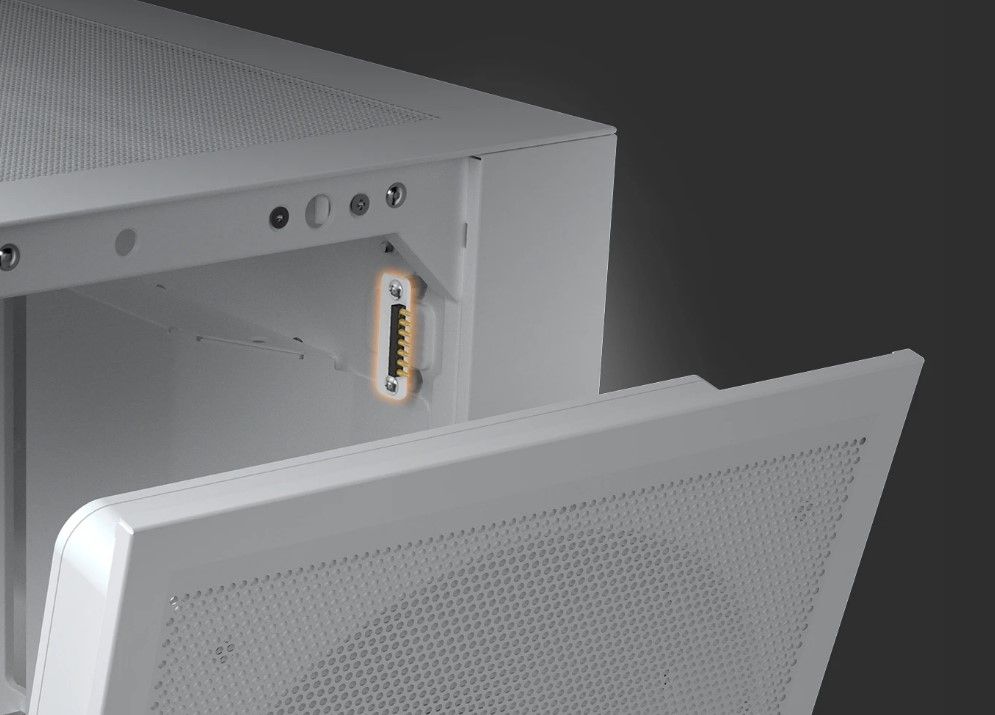 Модуль передньої панелі “3-в-1” — що об’єднує пиловий фільтр, два попередньо встановлених 160-міліметрових вентилятори ARGB PWM і сітчасту панель в один попередньо зібраний блок — дозволяє виконувати технічне обслуговування одним простим кроком. Пиловий фільтр магнітно кріпиться до рами, два 160-мм вентилятори ARGB PWM (попередньо встановлені) встановлюються в раму, попередньо прикріплену до передньої сітчастої панелі, передня сітчаста панель і попередньо прикріплена рама утворюють єдиний закінчений компонент.