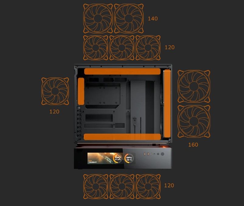 Сумісний з материнськими платами із зворотним роз’ємом і підтримує відеокарти довжиною до 400 мм, корпус CFV235 Mesh Vision розроблений для ігрових систем майбутнього. Кришка виконує три функції: направляє повітряний потік, полегшує прокладку кабелів і служить тримачем відеокарти. Її розташування можна оптимально підібрати відповідно до параметрів материнської плати. Це дозволяє максимально ефективно використовувати доступний простір, не тільки зменшуючи кількість кабелів, але і підвищуючи стабільність роботи.
