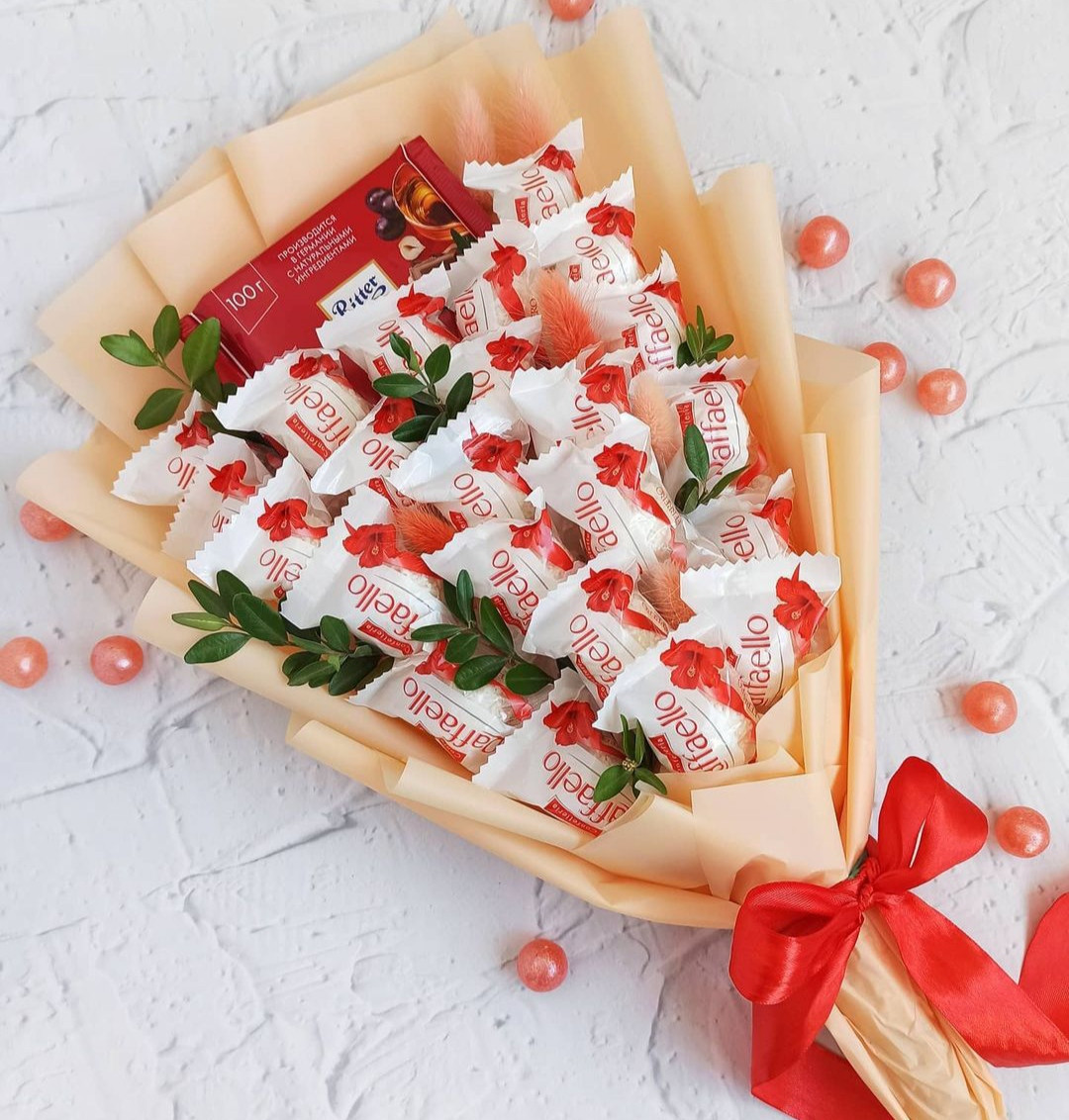 Вишуканий букет у бежевій упаковці, перев’язаний яскравою червоною стрічкою. Усередині — ніжні цукерки Rafaello, плитка шоколаду Ritter Sport та свіжа зелень, яка додає свіжості та контрасту. Це стильний і сучасний подарунок, який поєднує смак і естетику, створюючи незабутнє враження.