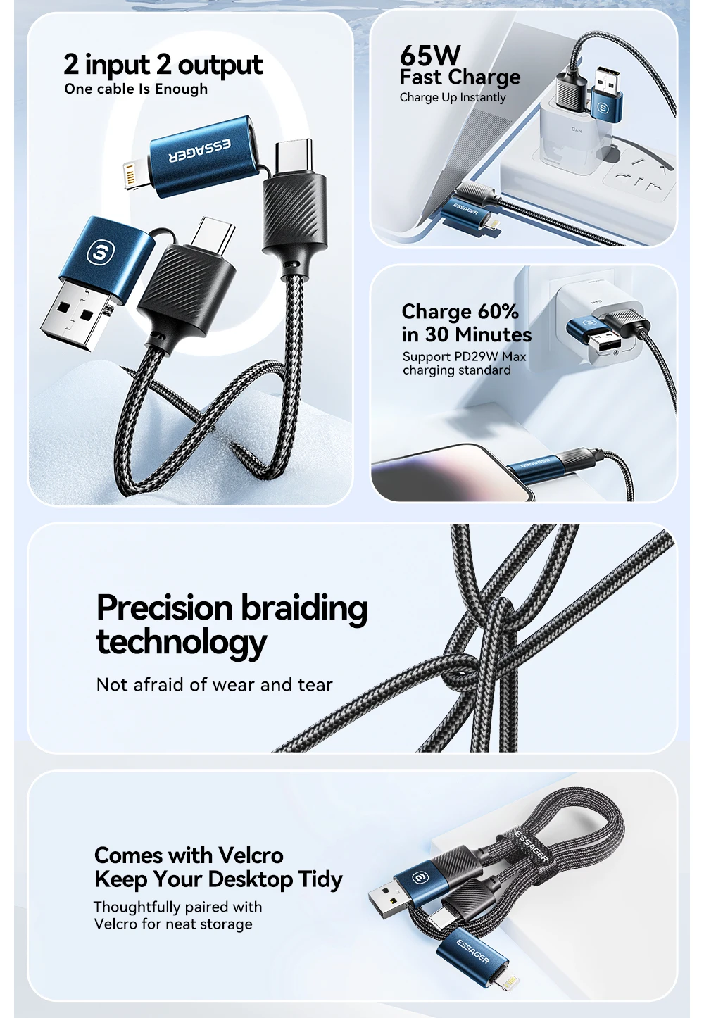 Кабель зарядки Essager 65W 4-в-1 USB-A/Type-C to Type-C/Lightning 1м: