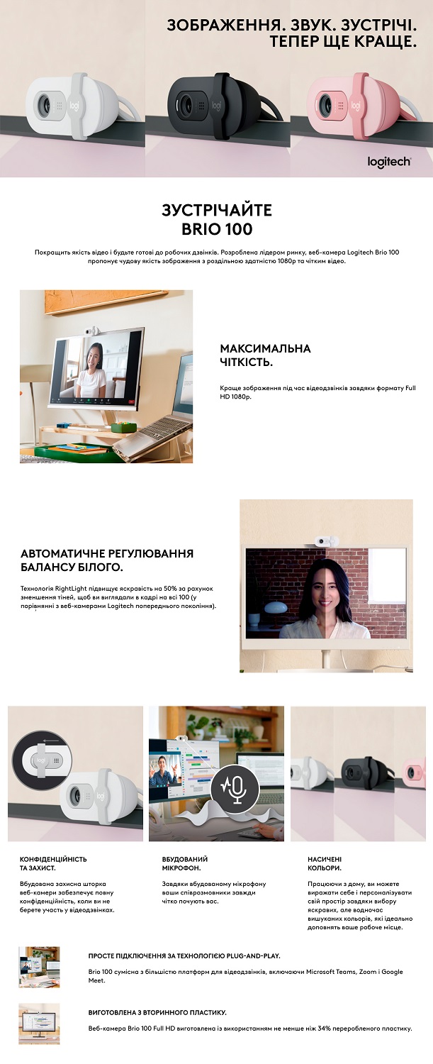Веб-камера Logitech BRIO 100 FHD OFF-WHITE (960-001617)