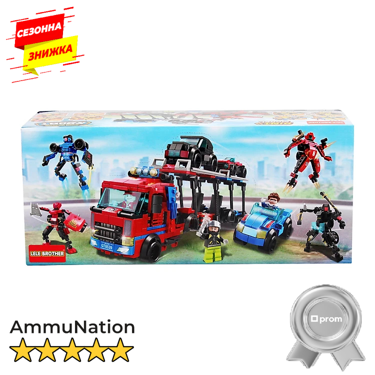 Робот трансформер LELE Brother 8539 DIY Brick Block Building Block AmmuNation Конструктор "Машини та Роботи" LeleBrother 886 деталей серія Трансформери - це відмінний вибір і для подарунка, і для розвитку дитини. Ціна за 1 шт. У комплекті даного конструктора 8 коробочок з самостійною іграшкою, яка є машиною, яка може ставати роботом, тобто. у кожній з 8ми коробочок конструктор 2 в 1. З комплекту в 8 коробочок збирається величезна вантажівка - автовоз з машинками. Інструкція зі складання в комплекті, барвиста та зрозуміла для цікавого складання та добре проведеного часу. 8539-1 синя машина / робот 123 деталі 8539-2 синя машина/робот 106 деталей 8539-3 чорний тягач/робот 105 деталей 8539-4 чорна машина/робот 115 деталей 8539-5 червона машина/робот 111 деталей 8539-6 червона машина/робот 114 деталей 8539-7 червона машина/робот 107 деталей 8539-8 червона машина зі сходами/робот 105 деталей Можливість відтворювати неповторний ігровий світ, не вдаючись до використання комп'ютера, дозволяє розвинути уяву дитини, а також стимулює розвиток дрібної моторики. Процес будівництва з барвистих блоків конструктора дуже цікавий, у дитини з'являється можливість для творчості. Також це розвиває логічне мислення, вчить його зосереджуватися та концентруватися на поставленому завданні. Для дітей та дорослих стане чудовим способом спільного проведення часу, адже збирати конструктор разом – це дуже цікаво. Складання обіцяє бути цікавою, а гра захоплюючою. Для дітей від 6 років.