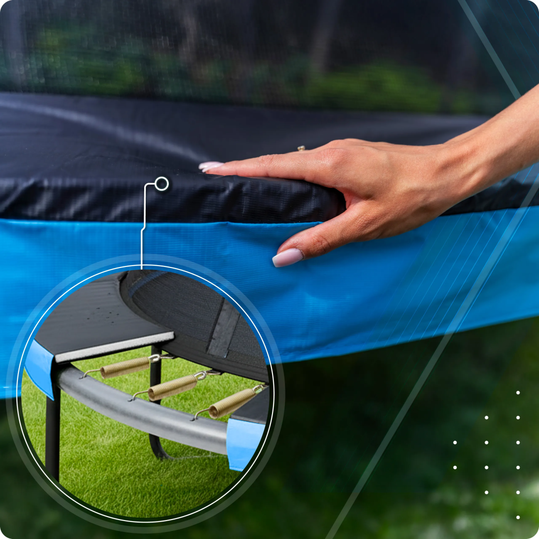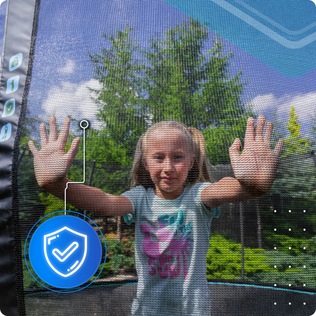 У батуті застосовано посилений захист преміумкласу, виготовлений з матового ПВХ та товстої, 10-міліметрової піни EPE. Таке поєднання забезпечує вищий рівень захисту пружин та більшу безпеку під час використання. Матове покриття надає конструкції сучасний та естетичний вигляд, що значно перевершує стандартні захисні кожухи з поліетилену. Завдяки міцній конструкції захисний кожух є довговічнішим та краще підходить для щоденного тривалого використання.