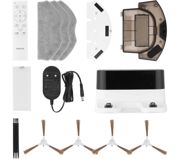 • Інше: 2 додаткові фільтри; 3 мопи; пульт дистанційного керування; контейнер для пилу з резервуаром для води; док-станція; щітка для чищення; адаптер живлення