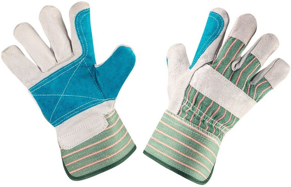 Рукавички робочі, сірий спилок, розмір 10.5, коров'яча шкіра і бавовняна тканина; стійкість до стирання (від 0 до 4) 3; стійкість до прорізання гострим предметом (від 0 до 5) 1; опір розриву (від 0 до 4) 2; опір проколу (від 0 до 4) 3; стійкість до порізів згідно EN ISO 13997 X; Застосування: всі транспортні роботи, вантажно-розвантажувальні роботи, складування, зберігання; Сертифікат CE.