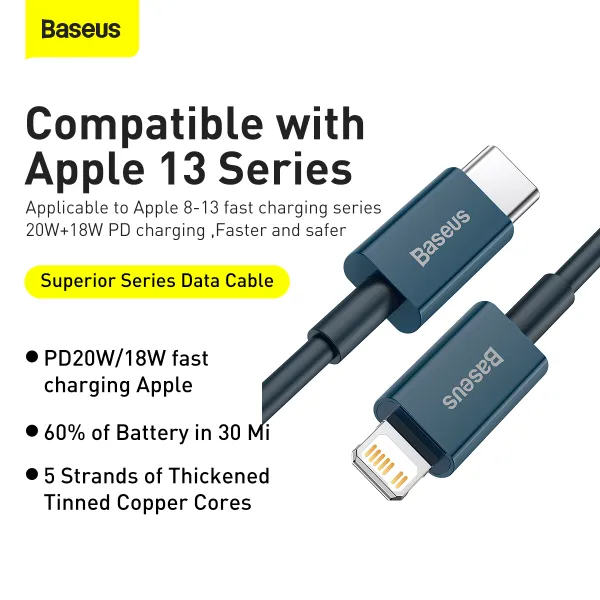 Кабель Baseus Superior Series Type-C to Lightning PD 20W створений для швидкого та безпечного заряджання пристроїв Apple, а також для стабільної передачі даних. Він ідеально підходить для iPhone, iPad, iPod та AirPods із роз’ємом Lightning. Завдяки підтримці технології Power Delivery потужністю до 20 Вт кабель дозволяє значно скоротити час заряджання. Наприклад, смартфон iPhone 13 може відновити до 60% заряду приблизно за 30 хвилин.