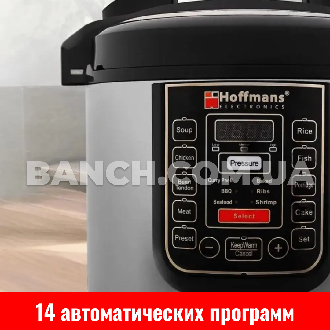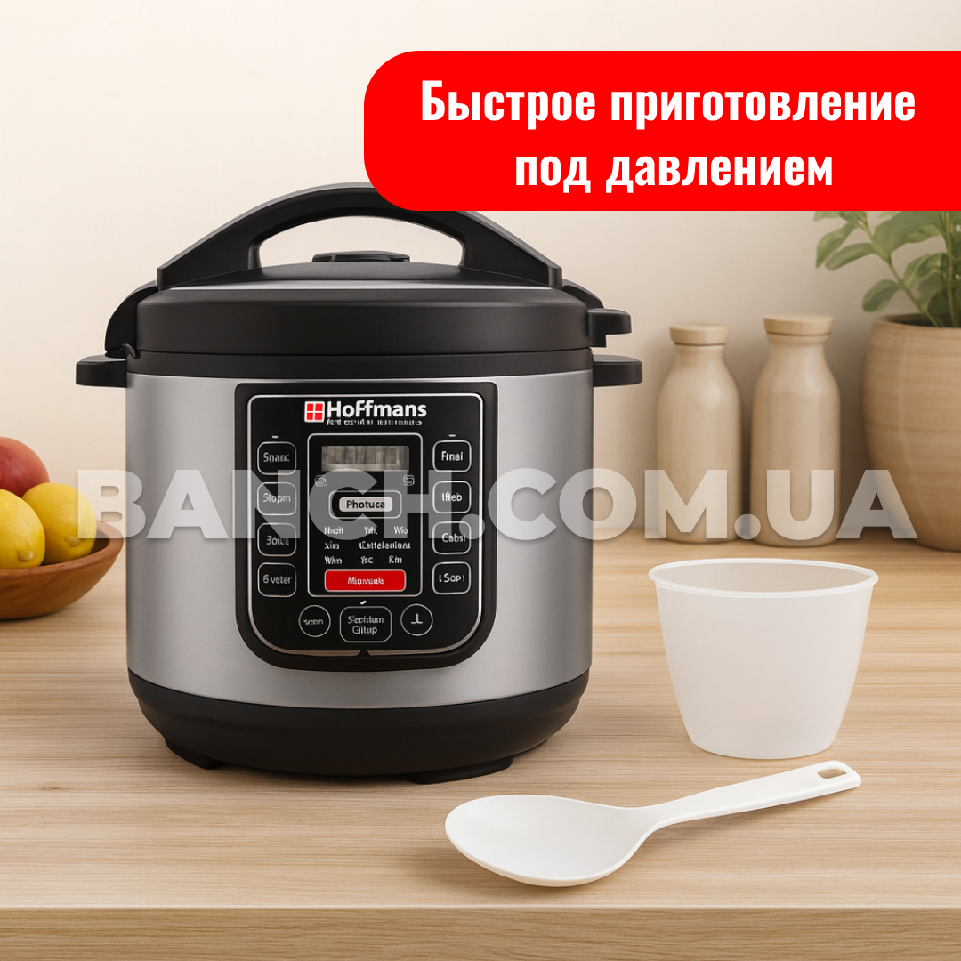 Мультиварка-скороварка Hoffmans HM-716 — функціональний і зручний у використанні прилад, створений для того, щоб спростити щоденне приготування їжі. Завдяки об'єму 6.5 л і потужності 1200 Вт, вона легко справляється з приготуванням великих порцій, а 14 автоматичних програм дають змогу вибрати оптимальний режим для будь-яких страв: від рису та каш до супів, м'яса та тушкування.