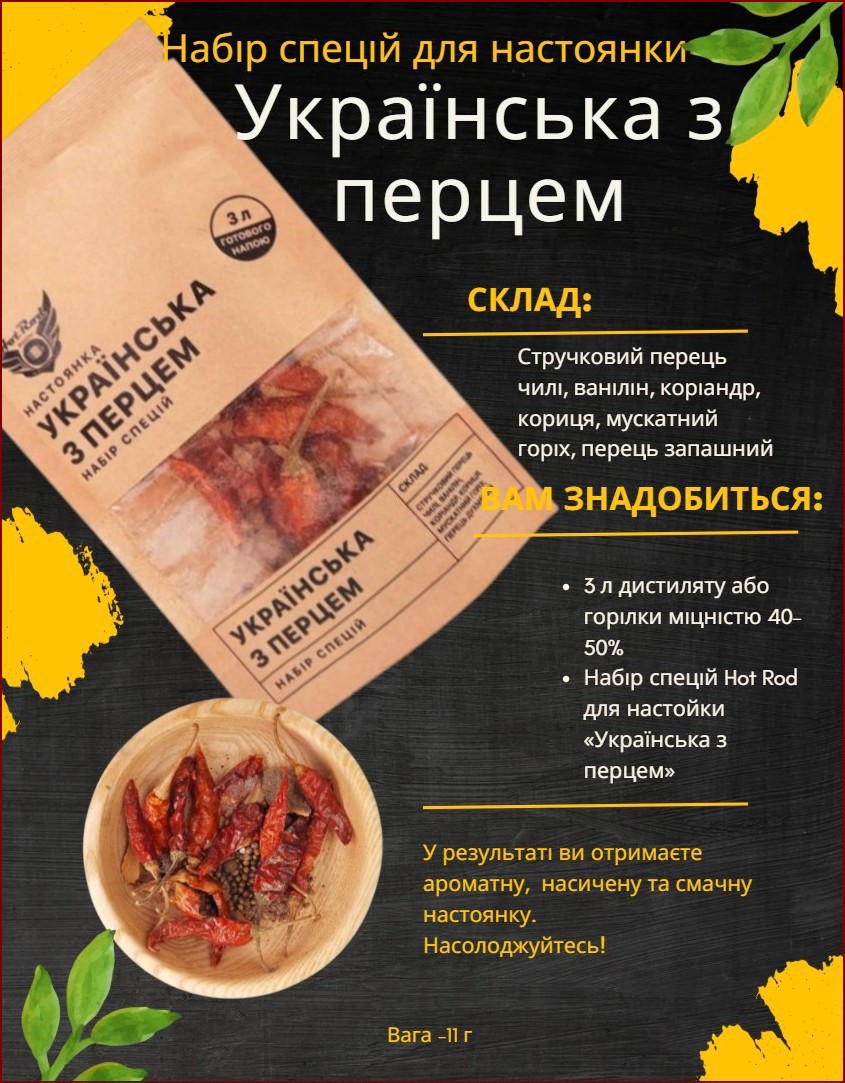 Він стане ідеальним подарунком для тих, хто прагне експериментувати зі смаками або лише починає свій шлях у мистецтві виготовлення домашніх настоянок. Це не просто набір спецій — це справжня лабораторія для створення оригінальних настоянок, лікерів та ароматних напоїв.