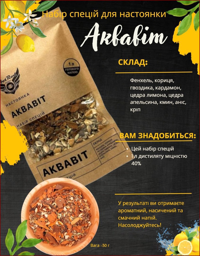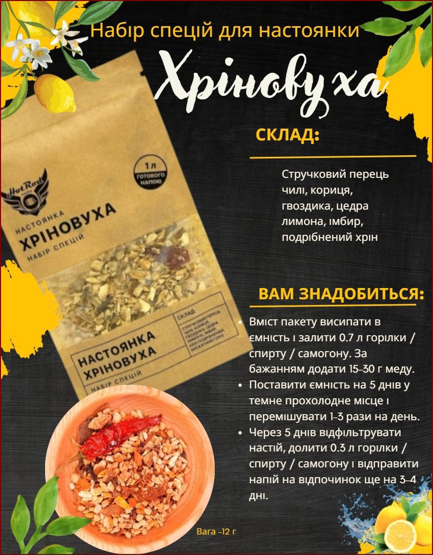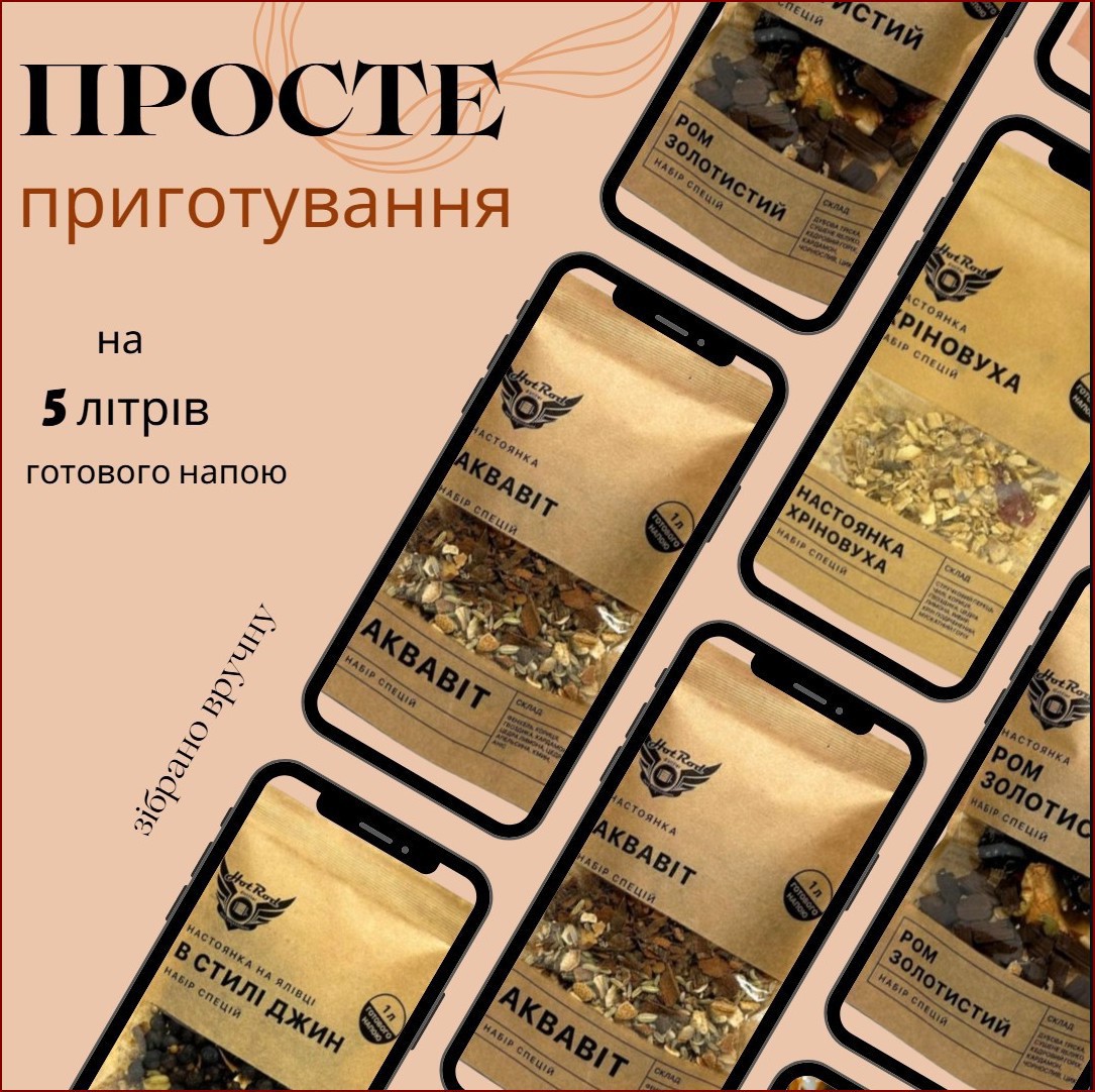 До складу набору входять 5 ретельно відібраних сумішей спецій, трав і натуральних компонентів, з яких ви зможете приготувати до 5 літрів смачних настоянок. Додайте лише основний дистилят — і насолоджуйтесь напоєм, який вражає своєю глибиною смаку та багатством аромату.