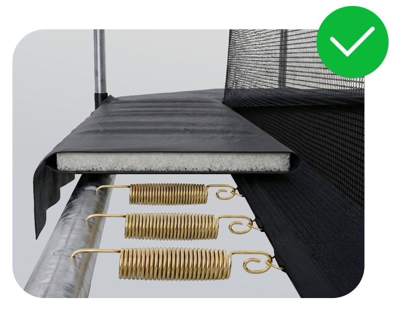 Батут оснащений щільною системою довгих, міцних пружин, виготовлених з дроту товщиною 3,2 мм. Така система підтримує потужні відштовхування та амортизує приземлення.
