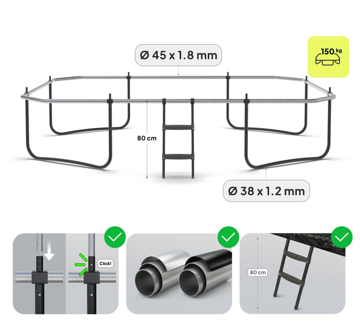- Батут: 315 × 189 см, матеріал PP 275 г/м²