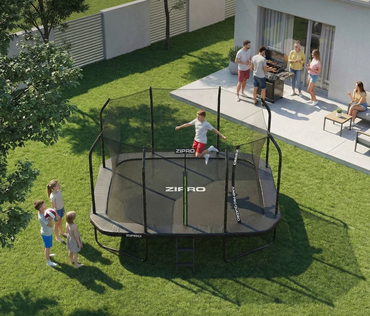 Батут ZIPRO JumpPro Quadro 8 x 12 футів. Прямокутна форма Quadro дозволяє виконувати потужніші та контрольованіші стрибки, точно такі, як у професійному батутному парку. Це ідеальний вибір для тих, хто хоче стрибати вище, безпечніше та динамічніше — як для розваги, так і під час тренувань.