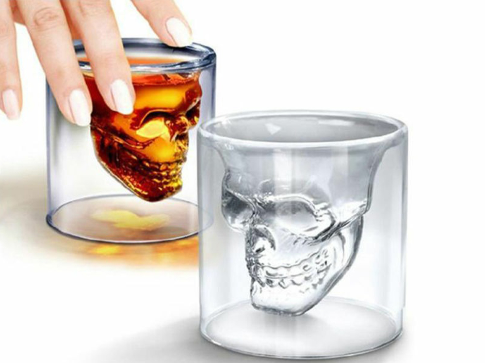 Адже цей стакан двошаровий і його внутрішня сторона виконана у вигляді черепа.Еслі налити напій в стакан, то череп 3D придбає форму і буде таємниче і зловісно виступати з глибини склянки. Вид черепа змінюється від кольору або відтінку напою, який Ви будете наливати.