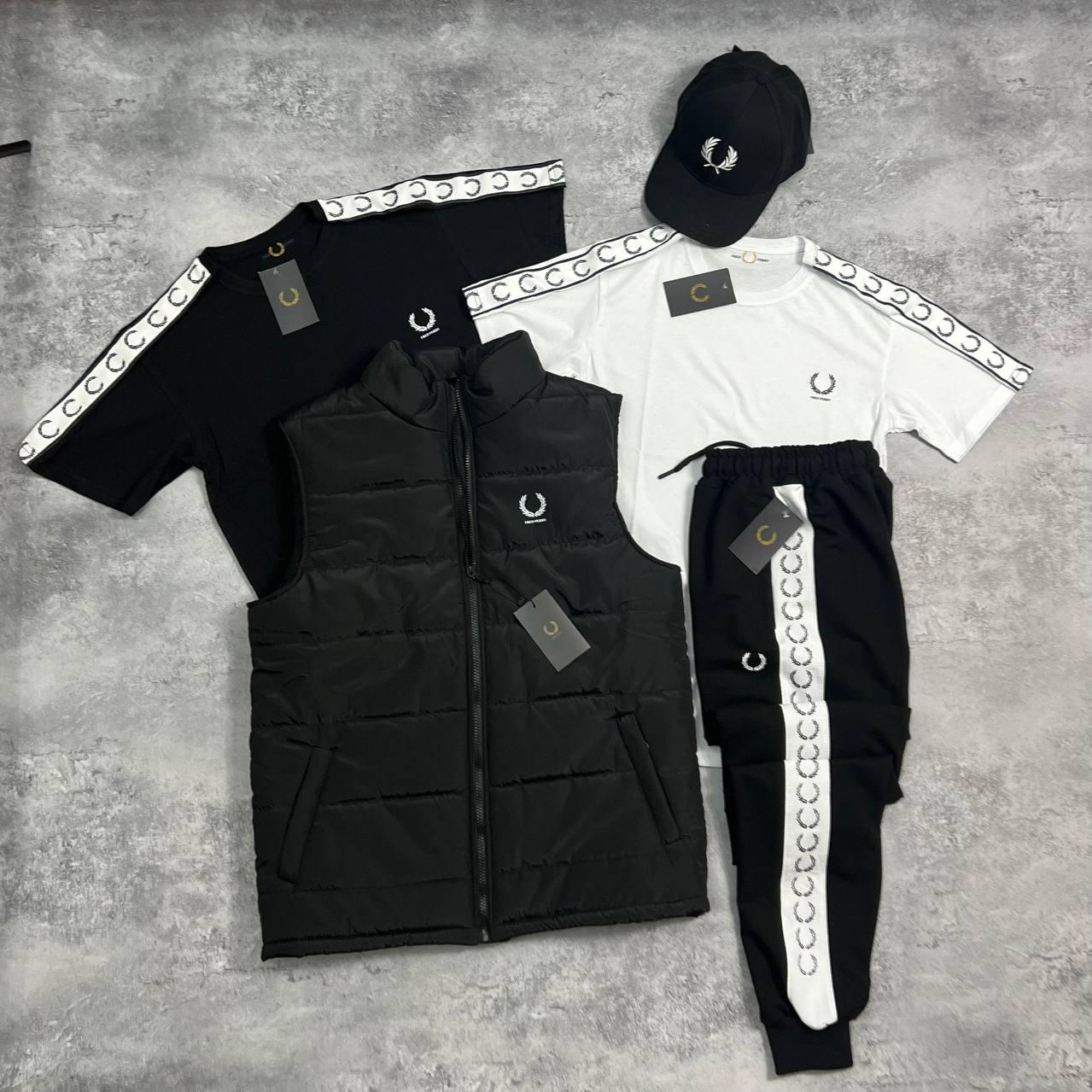 Комплект FRED PERRY включає у себе штани, дві футболки (чорну та білу), жилетку та кепку — все, що потрібно для створення стильного осіннього образу. Штани виготовлені з турецької двухнитки з бавовни та еластану (80/20), що забезпечує відмінну еластичність та комфорт. Вони мають манжети та кишені на замку, що додає функціональності.