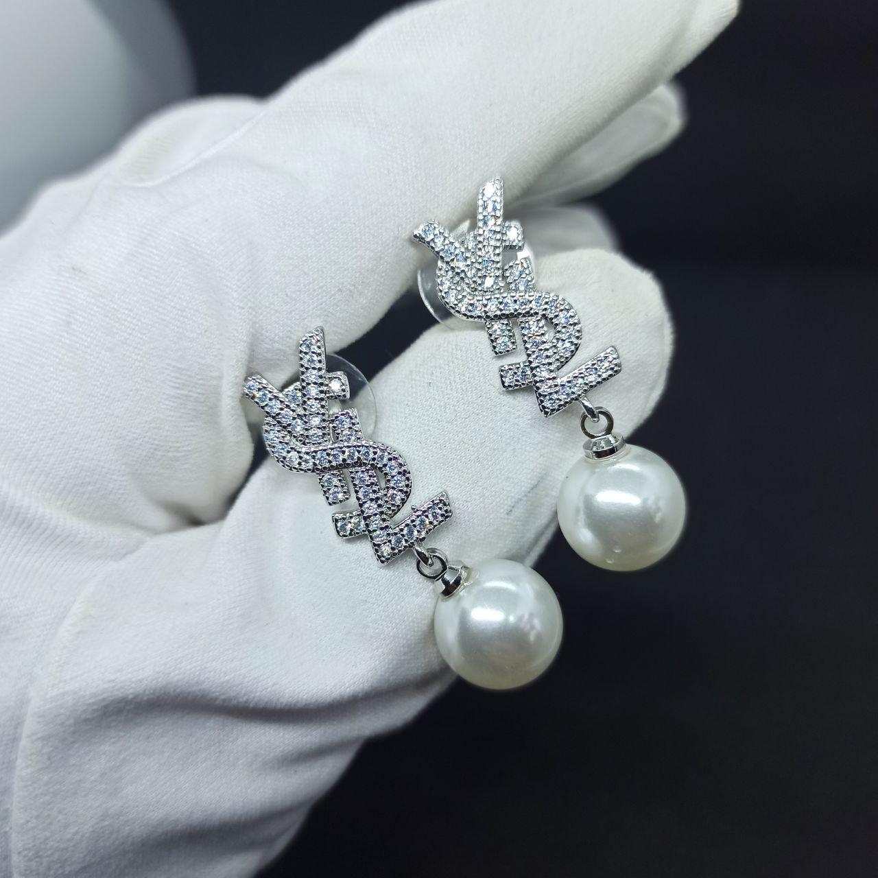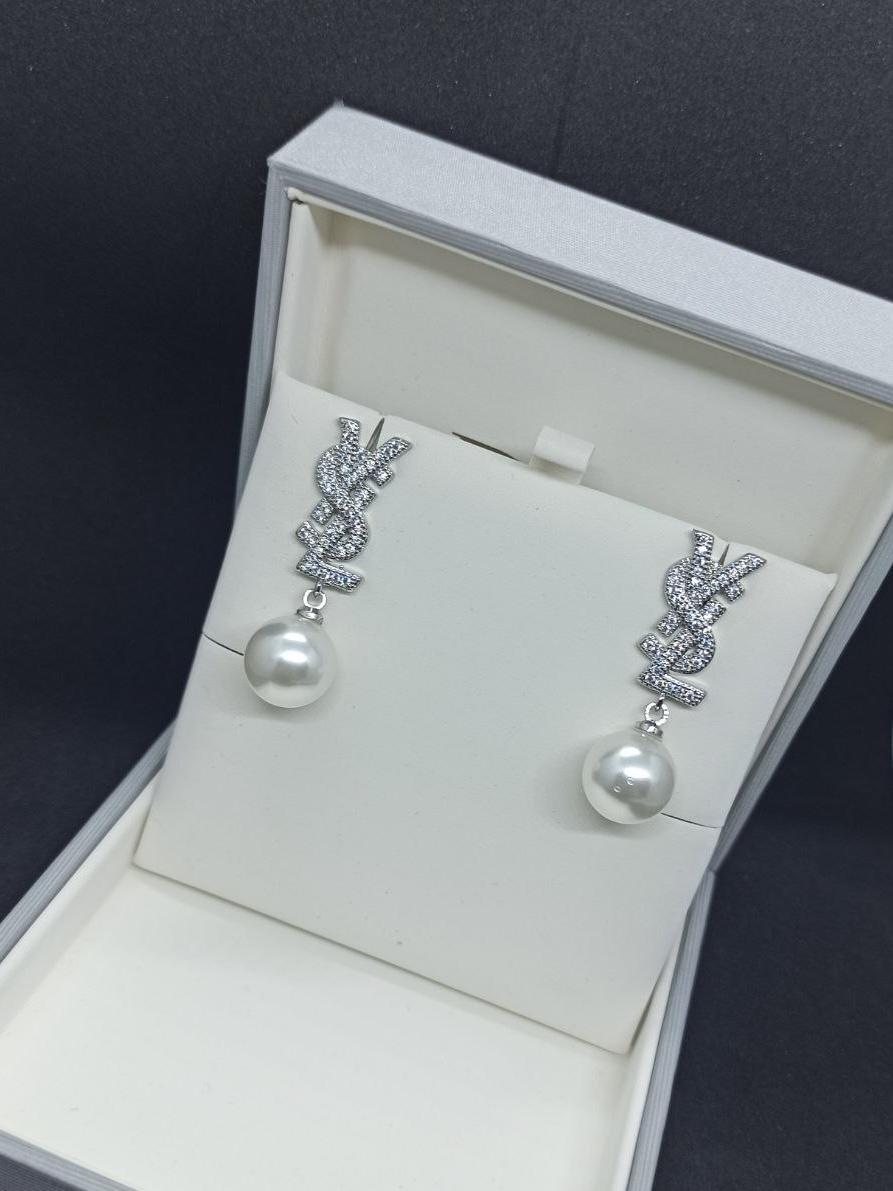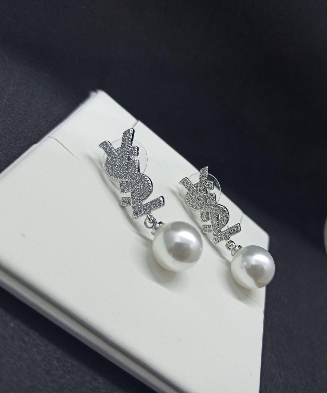 Сережки ів сен лоран брендові YSL лого з камінчиками сріблясті з перлинами Yves Saint Laurent