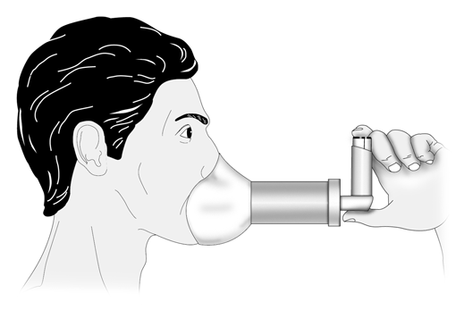 · тримати маску притиснутою до обличчя впродовж 6 вдихів після натискання на інгалятор;