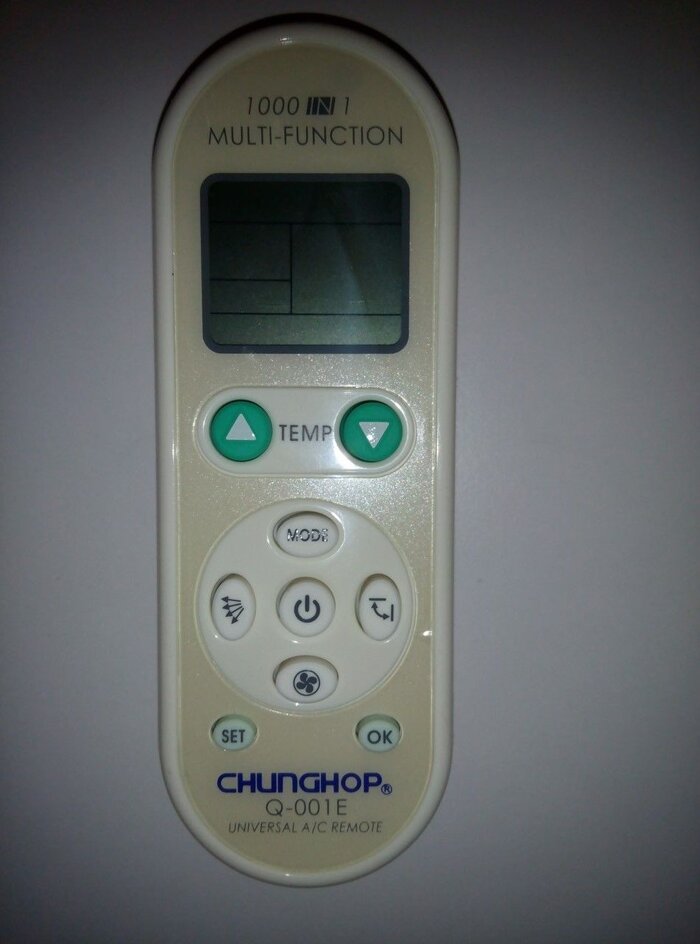 Пульт Q-001E - універсальний пульт для кондиціонерів, який підтримує велику кількість моделей кондиціонерів більш ніж 70-ти відомих брендів. Налаштувати пульт на роботу з Вашим кондиціонером, можна вибравши модель кондиціонера з бази пульта за допомогою таблиці кодів, або автопошуком, якщо "рідний" пульт Вашого кондиціонера невідомий.